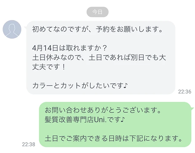 日付、曜日のご希望、メニューのご希望などありましたら、合わせてお送りくださいませ。